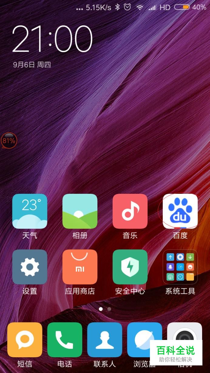 启动智能手机系统,如图所示。唤出用户主界面,点击"百度"图标。