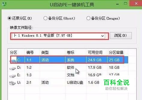 2、win8win7双系统安装的首要是先装win8系统,在u启动pe一键装机工具中选择win8镜像,安装在c盘,点击确定。