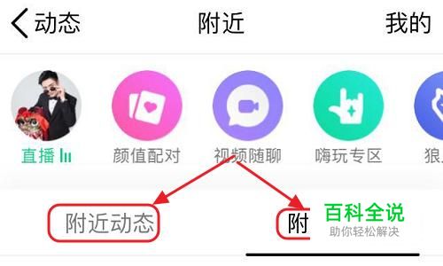 然后对应的页面上方即可看到“附近”选项了,点击以后系统目前分为“附近动态”和“附近的人”这两个部分;