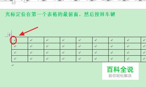 首先,最简单的办法就是将光标定位到第一个表格中的最前面,然后按一下键盘上的回车键,这样表格上方即可多出一个空行,不过很多人以为只有将光标定位在整个表格的最前面才行,事实上光标此时是无法定位在表格前面的;