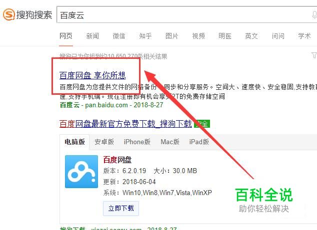 打开搜狗搜索,搜索“百度云”,点击官网链接并进入,如图所示。