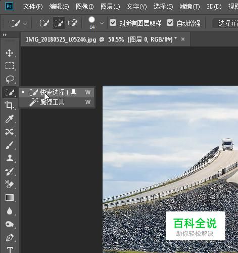 选中风景图层,再从工具栏中调出快速选择工具。把天空选中。