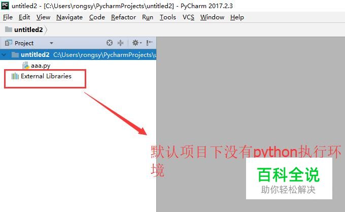 首先我们打开Pycharm软件,创建一个python项目,默认你会看到项目文件夹下面并没有执行环境,如下图所示