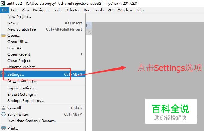 接下来我们点击顶部的File菜单,然后点击下拉选项中的Settings选项,如下图所示