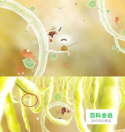 把青蛙赶出来,一共有四只。点击它们,就会唱歌。在它们唱歌的时候往左边走,让那只虫子把精灵们赶到底下去(如下图)。