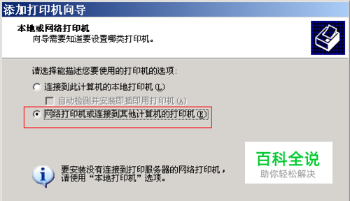 点击进入,选择第二项“网络打印机或连接到其他计算机的打印机” 点击“下一步”