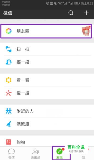 弹出的界面,我们点击发现,然后我们点击朋友圈;