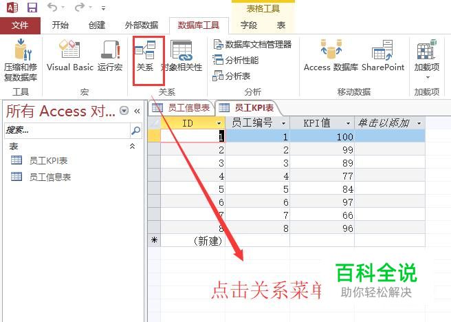 接下来点击Access顶部的数据库工具菜单,选择下面的关系选项,如下图所示
