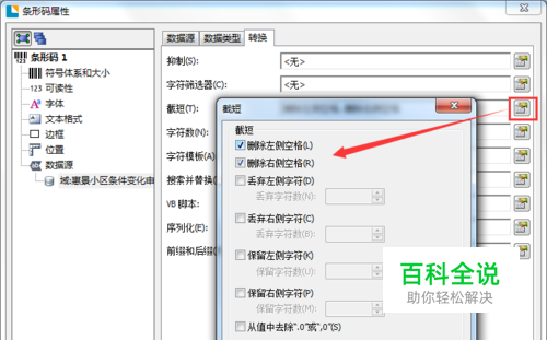 2、将属性对话框数据源选项切换到“转换”界面,单击“截短”右侧按钮,在弹出的对话框中勾选“删除左侧空格”及“删除右侧空格”,单击确定。