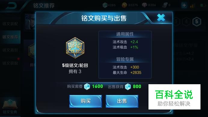然后,是他的铭文,蓝色的铭文搭配的是轮回,增加的是法术攻击和法术吸血。