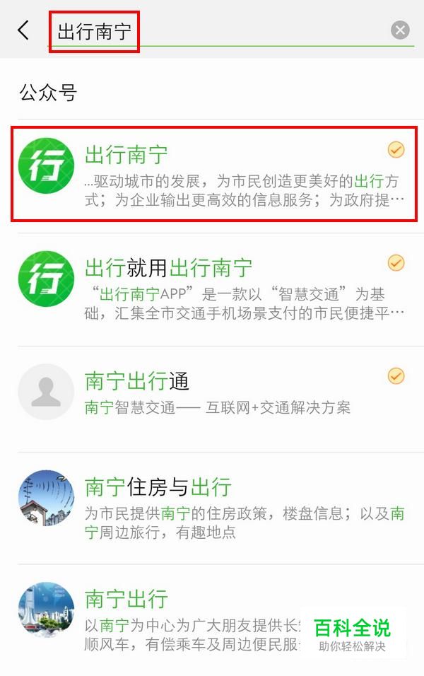 首先微信添加公众号中搜索“出行南宁”,前两个公众号都是官方的,点击第一个;