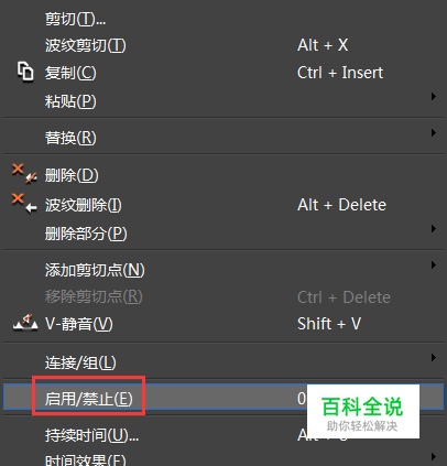 针对这样的情况,可以看出是视频等被全部禁止了,鼠标右点时间线轨道上每个素材,点击“启用/禁止”即可恢复素材,使之可编辑;