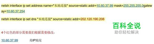将文本文件里的WLAN1改为你自己的网络连接名WLAN,设定此为公司固定IP,参照下图,将文本里的“IP1:”下面,“IP2”上面的source=static addr=10.60.1.176 mask=255.0.0.0 gateway=10.60.1.1,改为你自己电脑里的IP信息