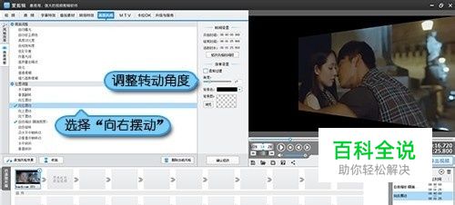 自由选择角度,倾斜片尾视频 在“画面风格”选项卡中的“画面调整”左侧栏处选择“向左摆动”、“向右摆动”、“沿垂直中轴转动”等画面风格,将画面倾斜。具体风格、倾斜角度、背景色及背景图等设置参数可根据个人喜好等实际情况调整。