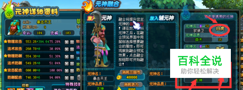 我们点击一段融合的按键进入元神融合界面,可以看到主元神是白虎属性的,所以副元神必须是白虎,我们选择符合要求的元神进行选择融合。