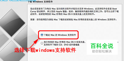 启动Boot Camp助理选择下载此Mac的windows支持软件,如果你有Mac OS安装光盘可以跳过这一部,因为Mac OS安装光盘里面已经包含windows支持软件。
