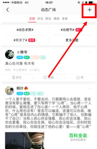 登录软件的首页界面,点击“动态广场”进入发布页面。
