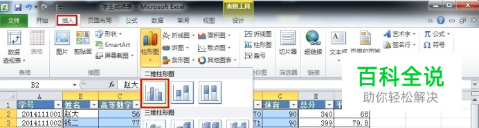 (2)选择想要设置成的图标样式(3)在此我选择了绿色渐变的柱形图颜色,一个完整的学生成绩总览表柱形图也就完成了