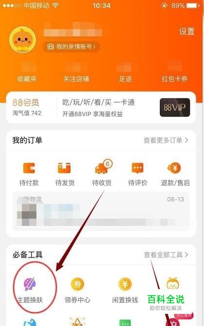 打开手机淘宝,然后点开 我的淘宝页面,在必备工具的第一个就是 主题换肤