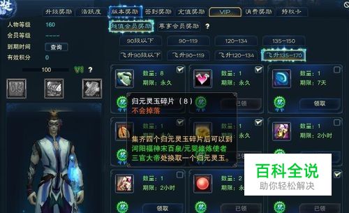 第一种:就是最简单的上线领取。只要你等级达到飞升135级,每日登陆游戏就可以在“VIP”→“超值会员奖励”→“飞升135-170”里领取8个归元灵玉碎片,可以在河阳“福神”或者“三官大帝”处换取两个归元灵玉。