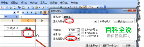 ctrl+F打开“查找替换”对话框。我们在查找范围里选择“公式”,并在查找内容里输入“3”,可以发现,查找范围为“公式”,由公式计算出来的结果并不在查找的范围之内。