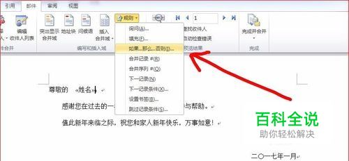 首先,先把光标定位在需要创建规则的位置,例如本例子中,需要在姓名后面根据性别插入“先生”或者“女士”的字样,那么就把鼠标定位在《姓名》的后方,然后点击“编写和插入域”工具组中的“规则”下拉箭头,选择“如果……那么……否则”选项。