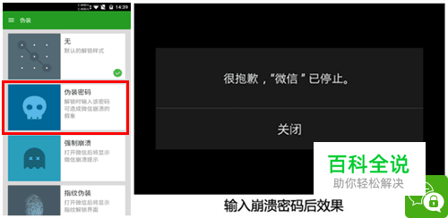微信锁就是专门为保护微信隐私而生的,其设计也都很贴心、人性。在使用微信锁伪装前你会说我有微信自带的声音锁就可以了,但相信你在使用微信锁的下面这些功能后,你就不会这样认为了。 伪装密码:解锁时输入该密码可造成微信崩溃的假象 简单理解就是可以设置两个密码,一个密码是可以直接进入微信里面;另一个密码(即设置的伪装密码)进去后则会看到如下图的提示,【很抱歉,“微信”已停止】。点击图上的[关闭]就会关闭微信、返回桌面。给别人制造一个假象,告诉他现在微信进不去、也用不了。你所担心的那些问题是不是分分钟就化解了。