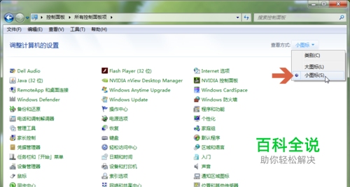 点击控制面板右上角的查看方式下拉菜单,将控制面板的查看方式设置成【小图标】。