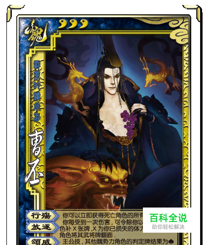 曹丕 3血 行殇 每当其他角色死亡时,你可以获得其所有牌;你可以获得死亡角色的所有牌。通称“收尸”,即当场上出现阵亡角色时,他所持有的手牌和已经装备的装备牌均成为曹丕的。需要注意的一点是,阵亡角色的判定牌不在此列,而杀死反贼后从牌堆获取的3张手牌也同样不在此列。收尸偶尔会促成一次小爆发,但是通常情况下还是以装备牌为多。 颂威 主公技:在曹丕为主公的游戏过程中,其他魏势力武将可以在判定结果生效后为曹丕补充1张手牌。比较容易想到的合作武将有会洛神的甄姬,以及可以改判定的司马懿和可以收判定牌的郭嘉。由于是否让曹丕摸牌的决定权掌握在对方手里,若是魏将在敌对阵营中,曹丕可是一点好处也捞不着的。 放逐 这是曹丕不二的核心技能,它也全面涉及了林包带来的新系统——翻面。 每受到一次伤害,便获得一次给人补牌并翻面的机会。“给我翻过来!”是曹丕的online台词,而对于已经处在翻面状态的武将,放逐是可以达到“给我翻回去!”的效果的。因而拥有放逐技能的曹丕不仅能很好地震慑对手,更将与队友的合作上升到一个新的高度。加之正在行动的武将若被翻面并不影响他本回合的行动,其实放逐也是可以起到保护队友的效果的。 血量多时,放逐敌对阵营(主要目标是像张辽、周瑜、貂蝉那种每回合能确保伤害输出的武将)血量少时,选择性放逐己方阵营(合作队友可以是曹仁那种会自己翻面的武将,也可以是小乔、袁绍那种利用AOE造成多点伤害的武将)。