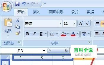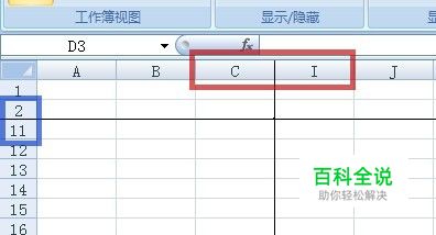 从“冻结拆分窗格”开始进行说明,“冻结拆分窗格”可在表格中的任意位置进行窗口冻结,冻结后,上部与左侧的窗格固定不变,不随拖动而改变。 这里以冻结“A、B、C”3列(图中蓝框),“1、2”2行为示例(图中蓝框),用鼠标左键单击图中红色“D3”单元格(图中红色箭头所指)