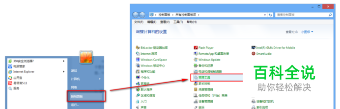 1、首先进入:“开始菜单→控制面板→管理工具”。