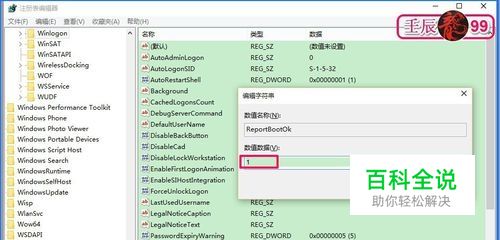 修改系统注册表的方法: 我们左键双击Winlogon对应右侧窗口的ReportBootOK,在弹出的编辑字符值对话框中,把ReportBootOK的数值数据从“ 0”更改为“ 1”,再点击:确定;