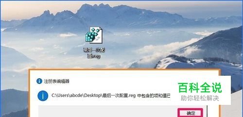 接着又弹出一个注册表编辑器对话框:C:\Users\abcde\Desktop\最后一次配置.reg中包含的项和值已成功添加到注册表中。我们点击:确定;