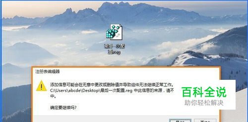 此时会打开一个注册表编辑器的询问对话框: 添加信息可能会在无意中更改或删除值并导致组件无法继续正常工作。如果你不信任 C:\Users\abcde\Desktop\最后一次配置.reg 中此信息的来源,请不要将其添加到注册表中。 确定要继续吗? 我们点击:是(Y);