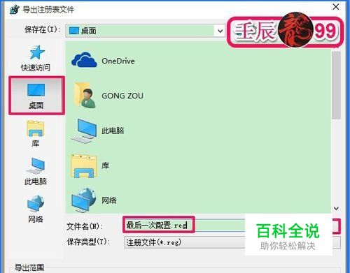 在打开的导出注册表文件窗口中,点击:桌面,在文件名(N)栏中输入: 最后一次配置.reg,再点击:保存,最后一次配置.reg注册表文件保存在系统桌面上。