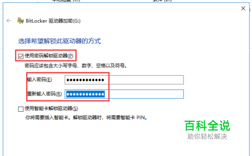 在弹出的对话框中勾选使用密码解锁驱动器,然后输入密码,最后点击下一步。