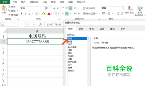 先将电话号手机号格式设为“常规”。 首先确保Excel中电话号手机号的单元格格式为“常规”,而不能为“数值”、“货币”、“日期”等格式,否则会影响电话号手机号的显示效果。