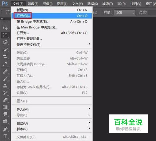 第一步:打开ps软件,在菜单栏“文件”中选择“打开”。