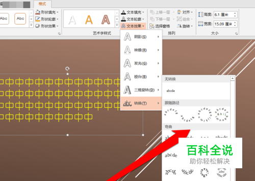 点击文本效果按钮以后,在文本效果的菜单按钮中,点击转换按钮。