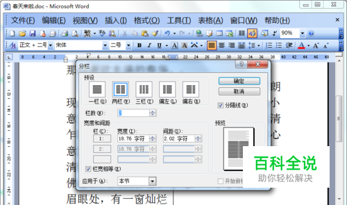 在打开的分栏窗口中,我们可以去设置分栏数,分隔线,宽度和间距等属性。我们设置好以后,点击确定。
