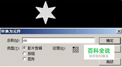 如上图所示,在图层1的第一帧中,画一个标准的六角星,效果如上图。 接着,还没完,我们得将这个六角星转换为元件,使用鼠标拖选的办法选中六角星对象,然后按下 F8 键,弹出如下图的对话框。