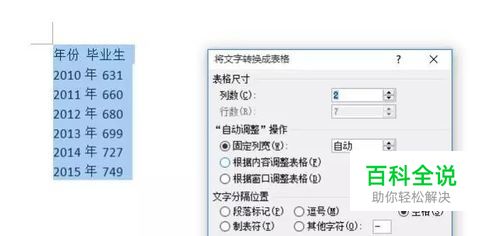首先输入一些文字,比如2010年到2015年中国高校毕业生人数(单位为万),要注意,应该分列的位置要用特别符号区分,比如空格、逗号、句号等,这里我用的空格,比如“年份”和“毕业生”之间有空格,下面的几列也一样。选中文字后,点击插入—表格—将文本转换成表格命令。
