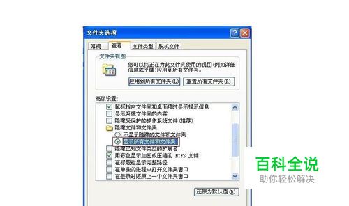 在文件夹选项窗口,切换到“ 查看”选项卡,找到“ 隐藏文件和文件夹”,然后选择“ 显示所有文件和文件夹”,单击“ 确定”,就可以查看被隐藏的文件和文件夹了。