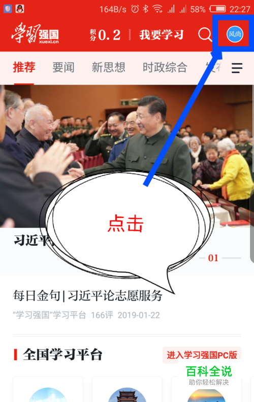 打开学习强国软件后,点击软件底部中间学习选项,在打开的学习界面,点击右上角的登录的头像。如图所示