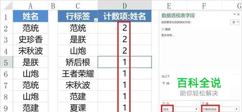 我们将 姓名字段分别拖进行(下方)区域和值(下方)区域,即可 看到各个数值的个数,并从中得出重复值(>1)和不重复值(=1)的数量。