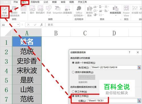 第1种方法:数据透视表方法。 我们选中A列数据后,依次选择 :"插入"菜单>"数据透视宝">设置"数据透视表"的位置(本例设置为当前工作表Sheet中的单元格)。