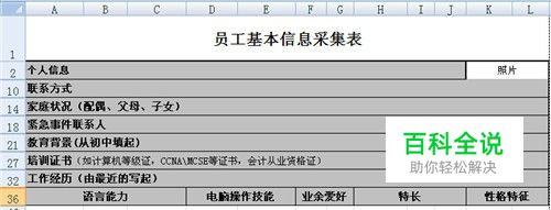 新建一个excel表格,在A1单元格输入标题“员工基本信息采集表”,然后依次在表格中输入个人信息、姓名、性别、出生日期、籍贯、身份证号码等内容(如图示),同时要注意留好空格,照片也要留有位置。