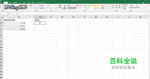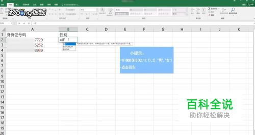 然后在“性别”栏输入“=IF(MOD(MID(A2,17,1),2),"男",“女”)”再“回车”。