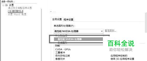 (NVIDIA的设置)选择(3D管理设置),然后在右侧的(全局设置)中。将首选图形处理器下方的选项,改为(高性能NVIDIA处理器),选择完成后,点击底部保存。
