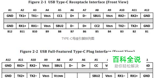 接口引脚: 由下图可以看到TYPE-C的接口引脚图,每个引脚都有不同作用,中心点对称因此支持正反插。 TX/RX:两组差分信号,用于数据传输 CC1/CC2:两个关键引脚,作用很多 探测连接,区分DFP、UFP 配置Vbus,有USB Type-c和USB Power Delivery(功率输出)模式 配置Vconn,当线缆内有芯片时,一个cc传输信号,一个cc变成供电Vconn 配置其他模式,音频配件等 GND和VBus,各4个,因此传输功率强 D+和D-是来兼容USB之前的标准的